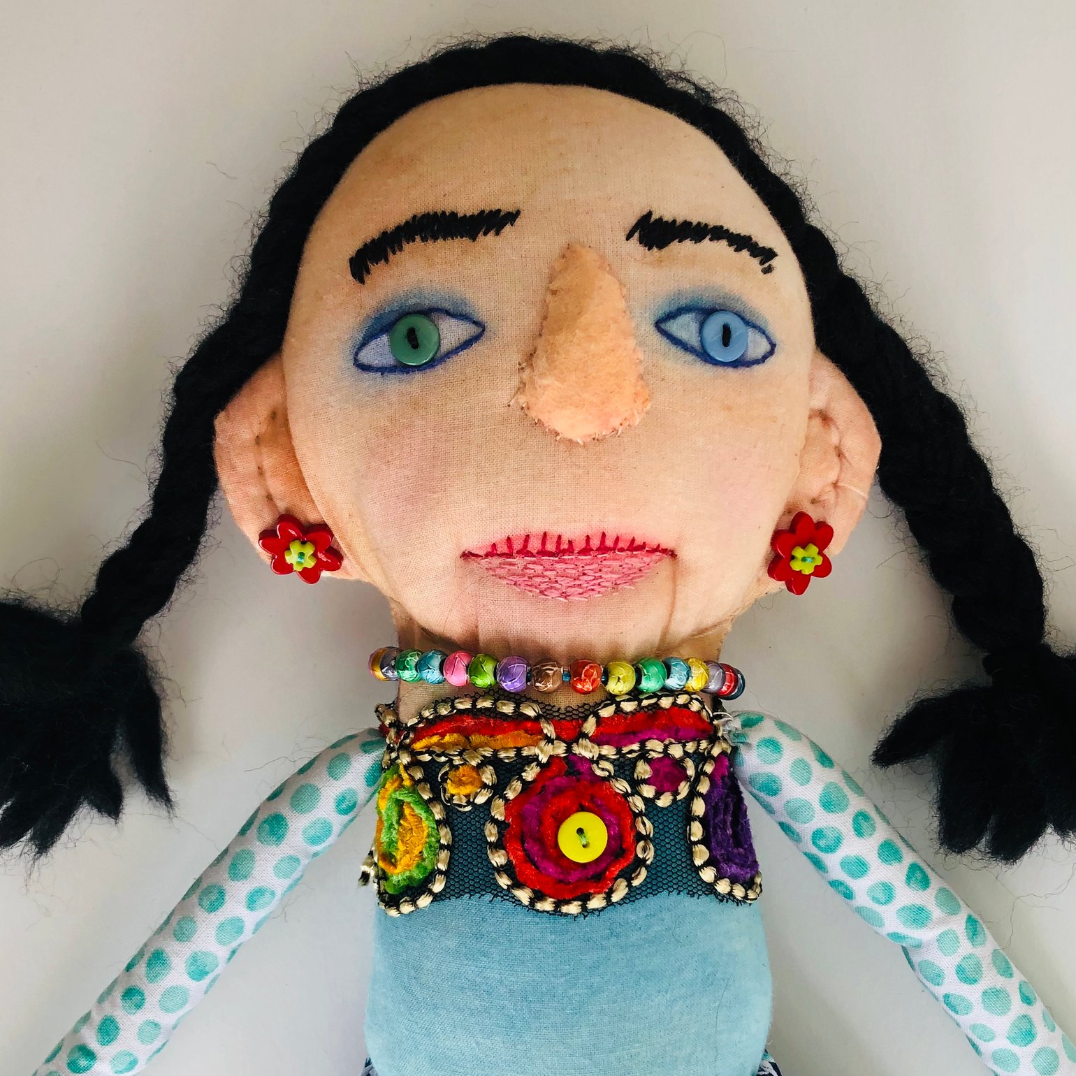 Dahlia is approximately 19 inches (48 cm) tall, made of hand colored cotton with embroidered and appliqued features, stuffed with hypo-allergenic fiberfill. Her top is hand painted and trimmed with fancy braid and buttons. She is wearing a beaded necklace and flower earrings. Her arms and legs were made separately and stitched on. She is not a toy and meant for display only. A loop can be sewn on the back of her head for hanging by request.