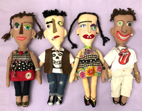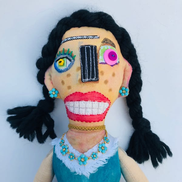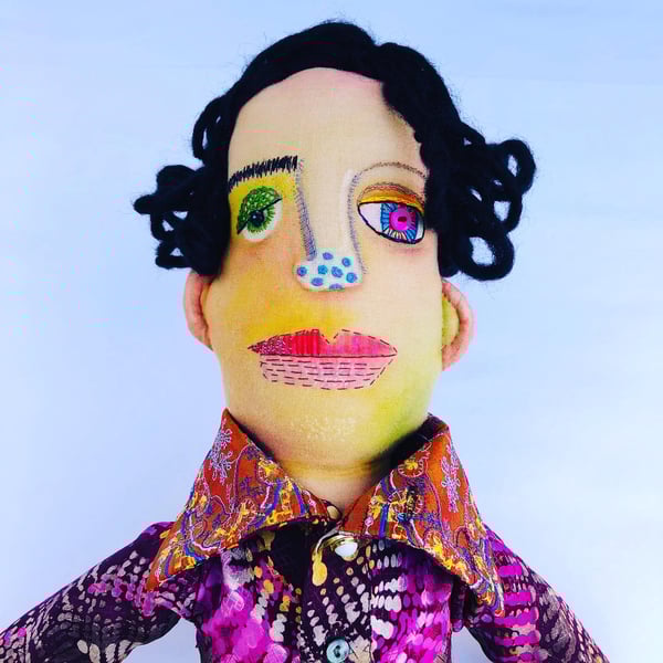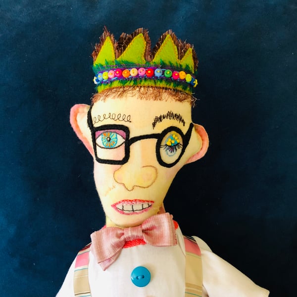 Frankie is approximately 26 inches (66cm) tall, made of cotton fabric and stuffed with hypoallergenic fiberfill. He is hand painted and embroidered with plenty of buttons. He is wearing comfy little moccasins and his best hat with hand made tassel. He has a little loop on the back of his head to hang him up.