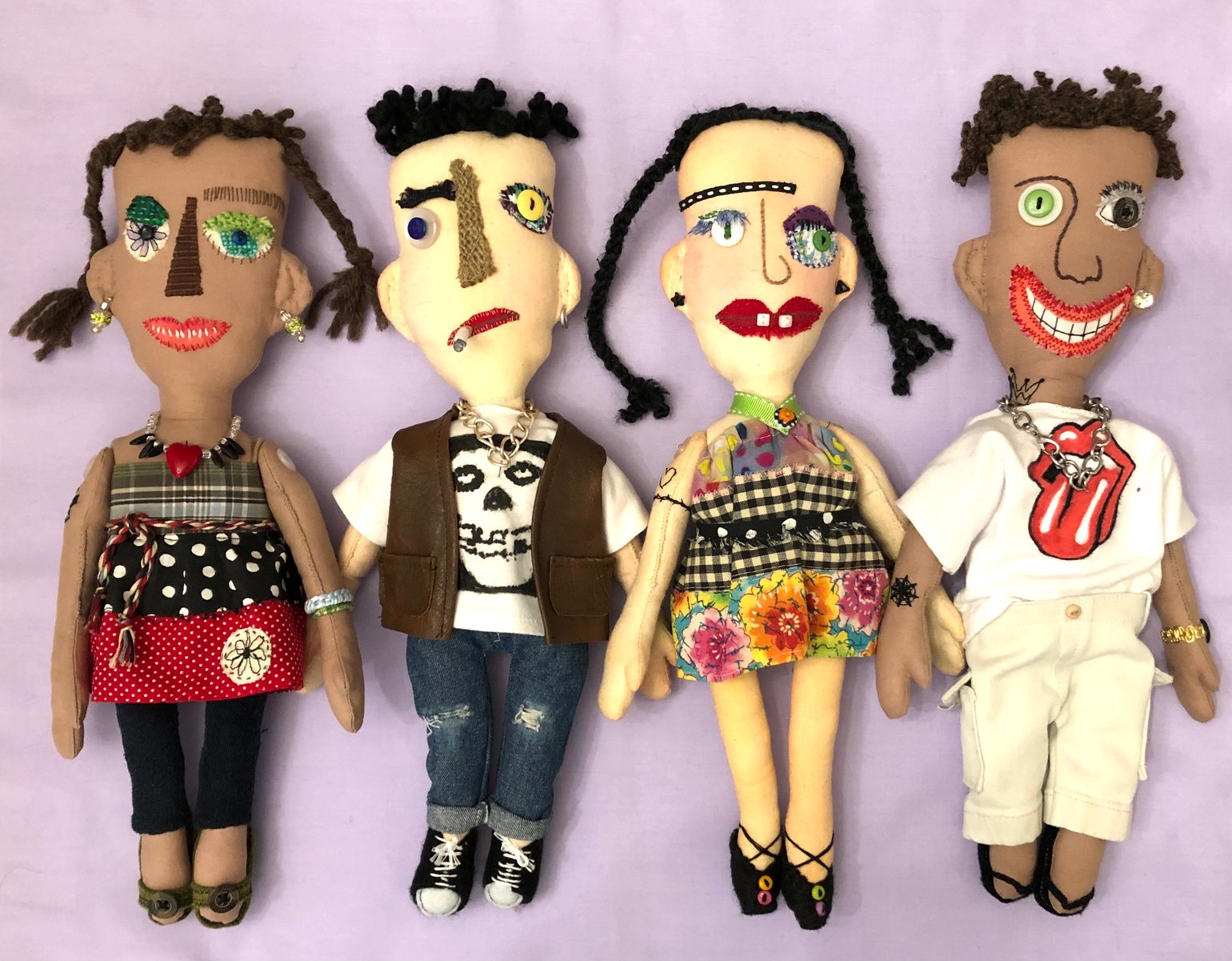 They are all made of hand painted, embroidered and appliqued cotton, with yarn hair. They are approximately 14 inches tall and all wear original, handmade clothes.
